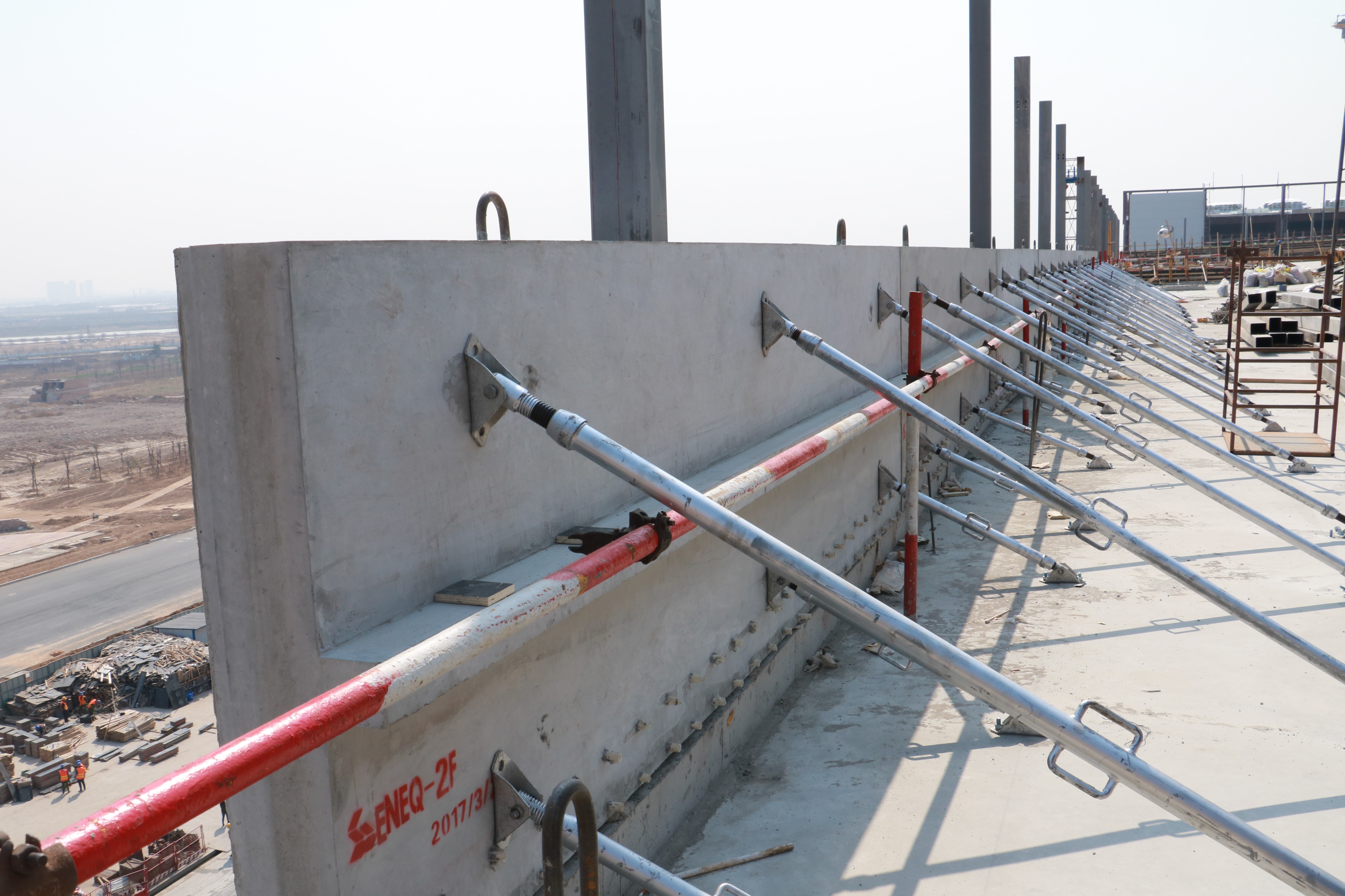 公司PC項目自去年12月投產(chǎn)以來,直面新型預(yù)制構(gòu)件市場難題,主動出擊,積極開拓,在完成自建裝配式項目的同時,拓展對外商業(yè)項目。在承攬到咸陽彩虹薄膜晶體管液晶顯示器女兒墻裝配式構(gòu)件任務(wù)后,積極與甲方和設(shè)計院協(xié)商溝通,解決技術(shù)難題,制定預(yù)制方案。 該項目位于咸陽市以西咸陽高新技術(shù)產(chǎn)業(yè)開發(fā)區(qū),建筑ACF廠房單體4/5層,占地面積122418.22m2,建筑面積479549.71 m2,建筑高度40.3m,由核心區(qū)和支持區(qū)構(gòu)成,長478m,寬259m。面對工期緊,生產(chǎn)任務(wù)大的壓力,公司群策群力、全力以赴。設(shè)計部員工每天早上七點從西安奔赴咸陽設(shè)計圖紙,晚上下班以后挑燈夜戰(zhàn),在短時間內(nèi)完成深化設(shè)計及模具設(shè)計,4天內(nèi)完成了設(shè)計圖紙144張。PC車間、模具車間、攪拌站、實驗室無論車間管理人員還是一線工人,按照設(shè)計圖紙,嚴(yán)把產(chǎn)品質(zhì)量關(guān),精心生產(chǎn),追求完美。功夫不負有心人,3天模具加工完成,第二天女兒墻墻板生產(chǎn)蒸汽養(yǎng)護后送往現(xiàn)場安裝。 由于套筒較多會帶來定位困難,產(chǎn)品確保了套筒的誤差在2mm以內(nèi),從而解決泛水混凝土澆筑問題,保證了構(gòu)件質(zhì)量。一塊塊女兒墻墻板的連續(xù)產(chǎn)出,凝結(jié)了新型建材團隊的合力。安裝現(xiàn)場預(yù)留鋼筋定位困難,公司快速設(shè)計加工定位卡具,按照卡具施工,預(yù)埋鋼筋平面定位準(zhǔn)確,操作方便,順利完成安裝。新型建材人以工匠精神和嚴(yán)謹(jǐn)作風(fēng),以每天8-10塊的速度進行安裝,使得該項目按時優(yōu)質(zhì)完成。 此次女兒墻項目考驗和鍛煉了隊伍,它的裝配成功,離不開團隊的智慧與打拼。新型建材人用執(zhí)著、拼搏、奮斗讓“彩虹”綻放出最亮麗的色彩。