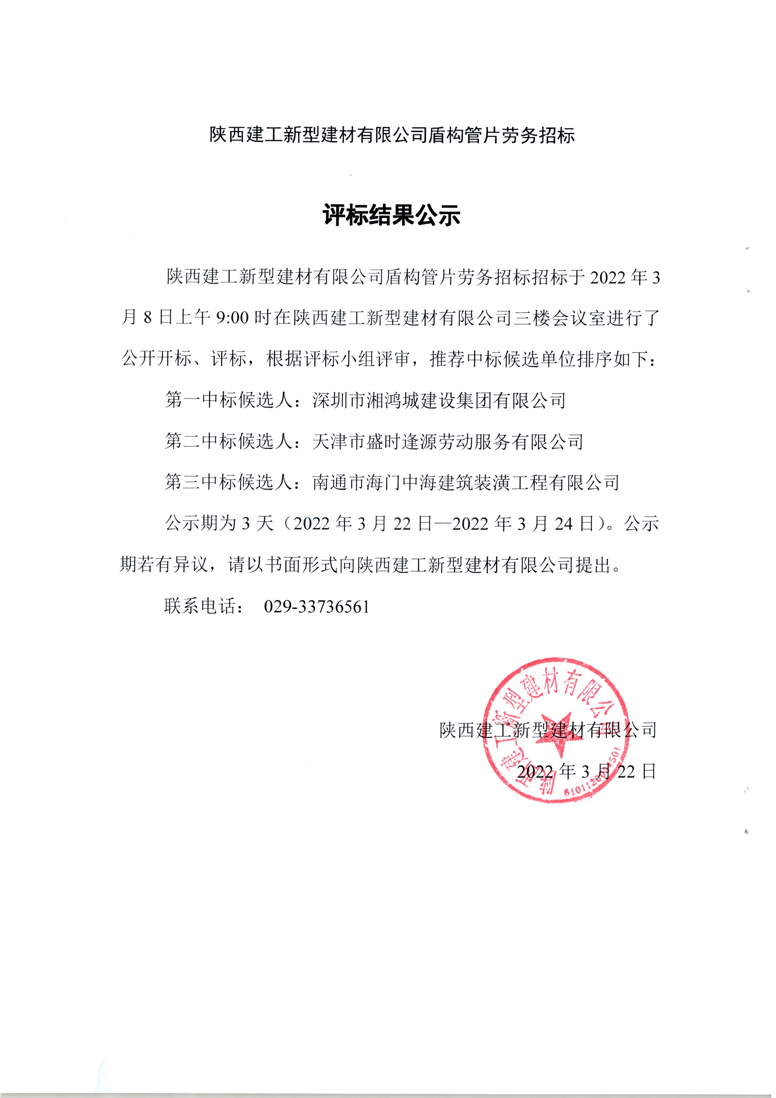 | 陜西建工新型建材有限公司盾構(gòu)管片勞務(wù)招標(biāo)結(jié)果公示 |