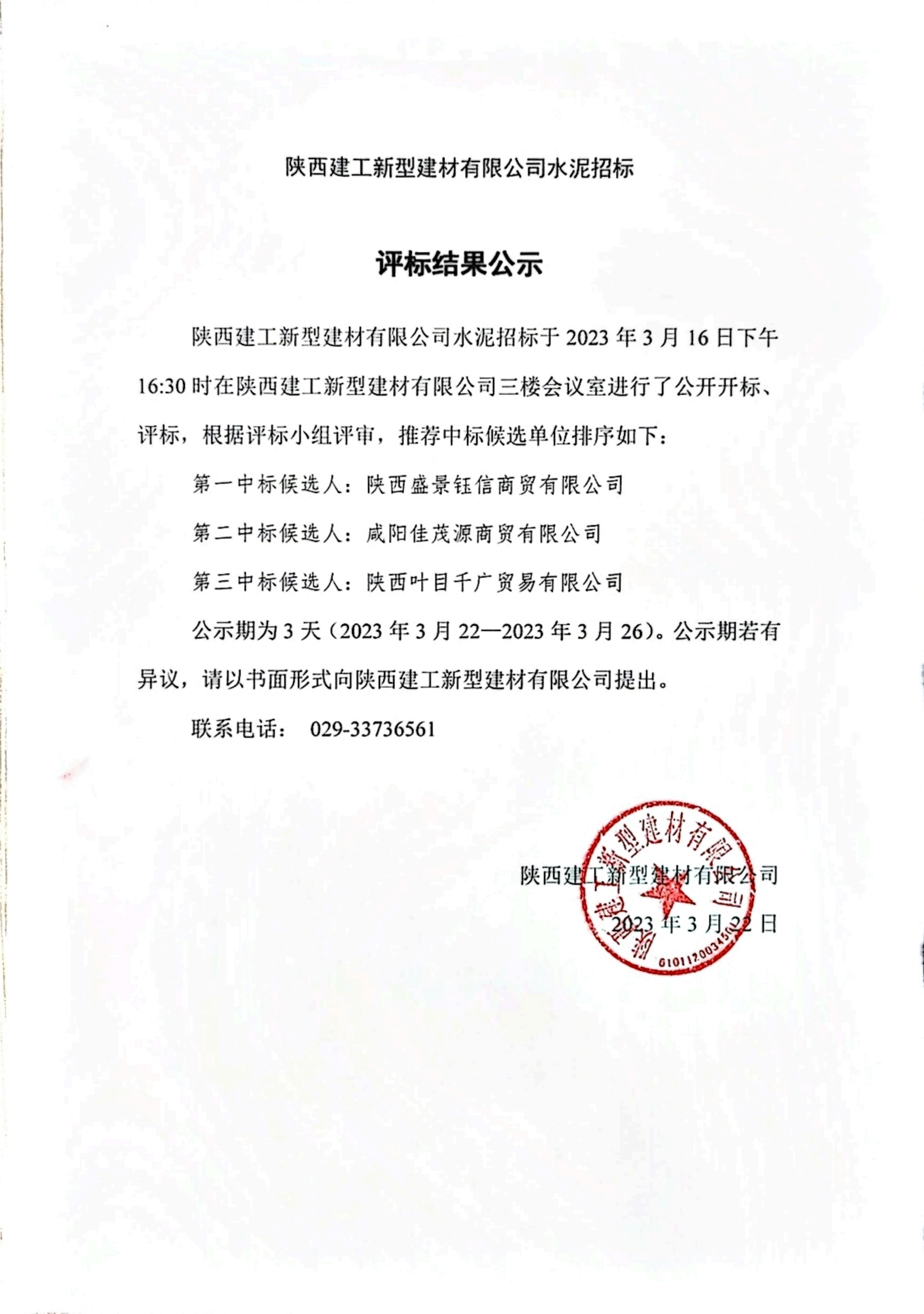 | 陜西建工新型建材有限公司水泥招標(biāo)評(píng)標(biāo)結(jié)果公示 |